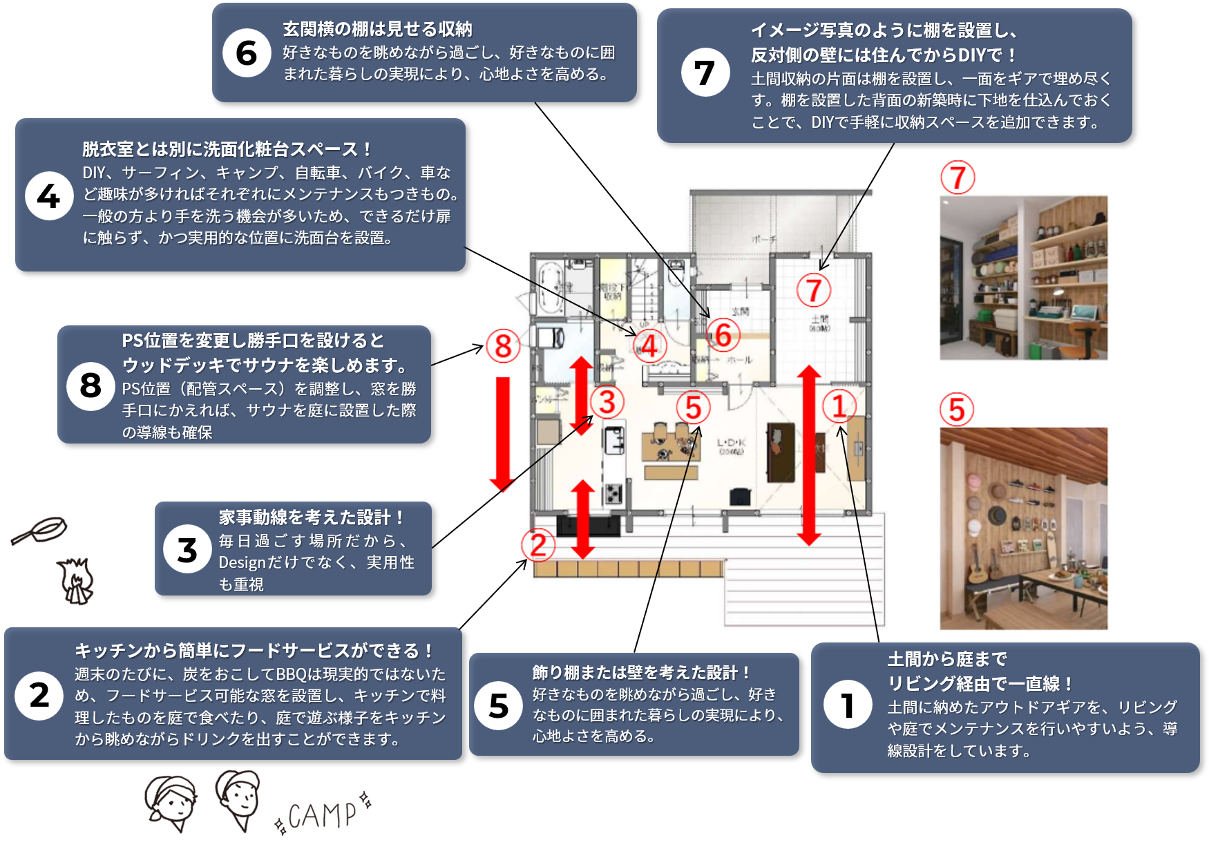 ウッドデッキとファイヤーピットで、庭がほぼキャンプサイトのように。またキッチンにつながる小窓を配置することでフードやドリンクも簡単に運び出せます。テントサウナを置いて、バスルームと直接行き来できる仕様にすればサウナーも満足の「ととのい」をお家で簡単に得られます。