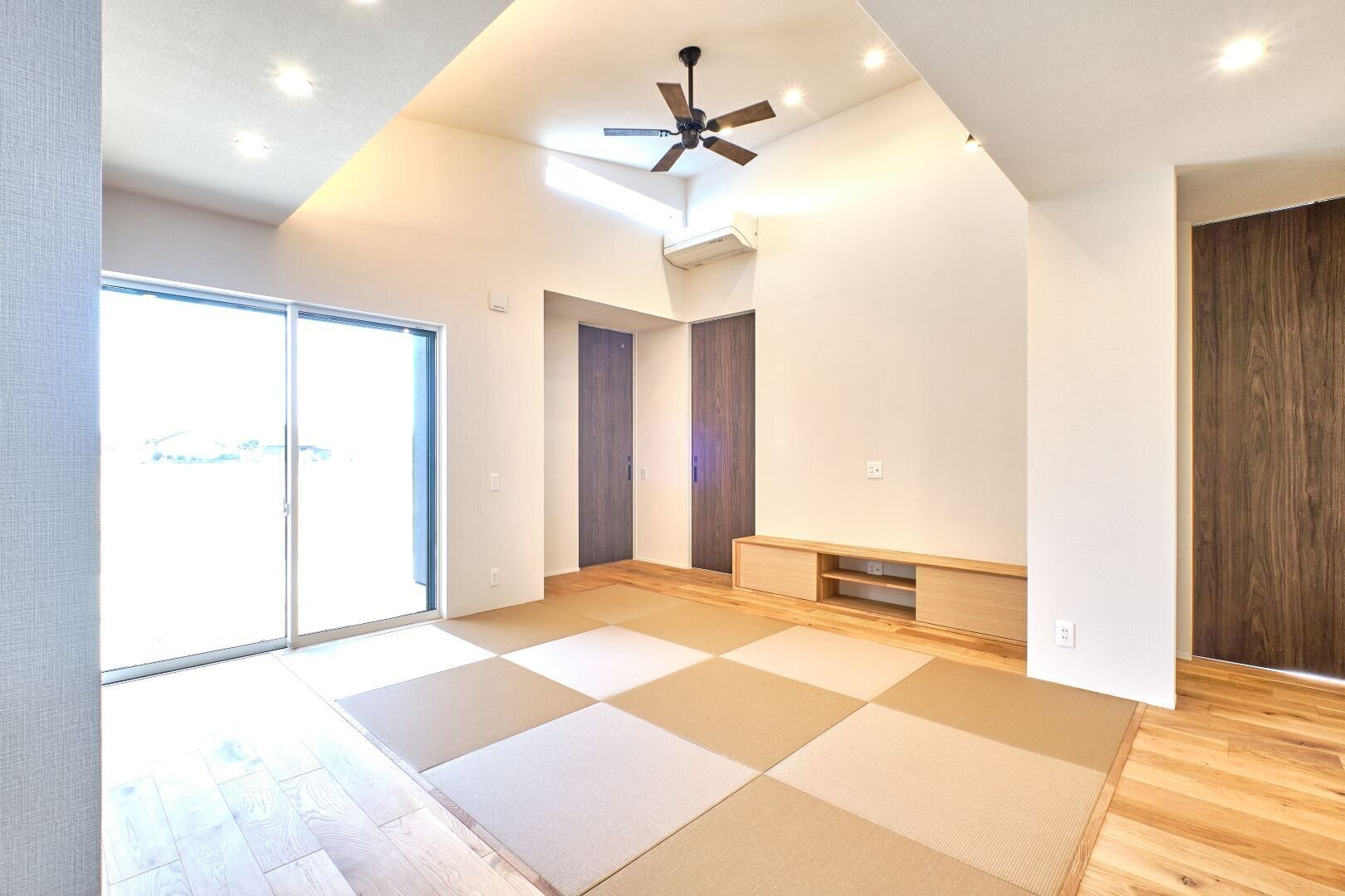 勾配天井にシーリングファンを設置した、開放感あふれるリビングが完成しました。