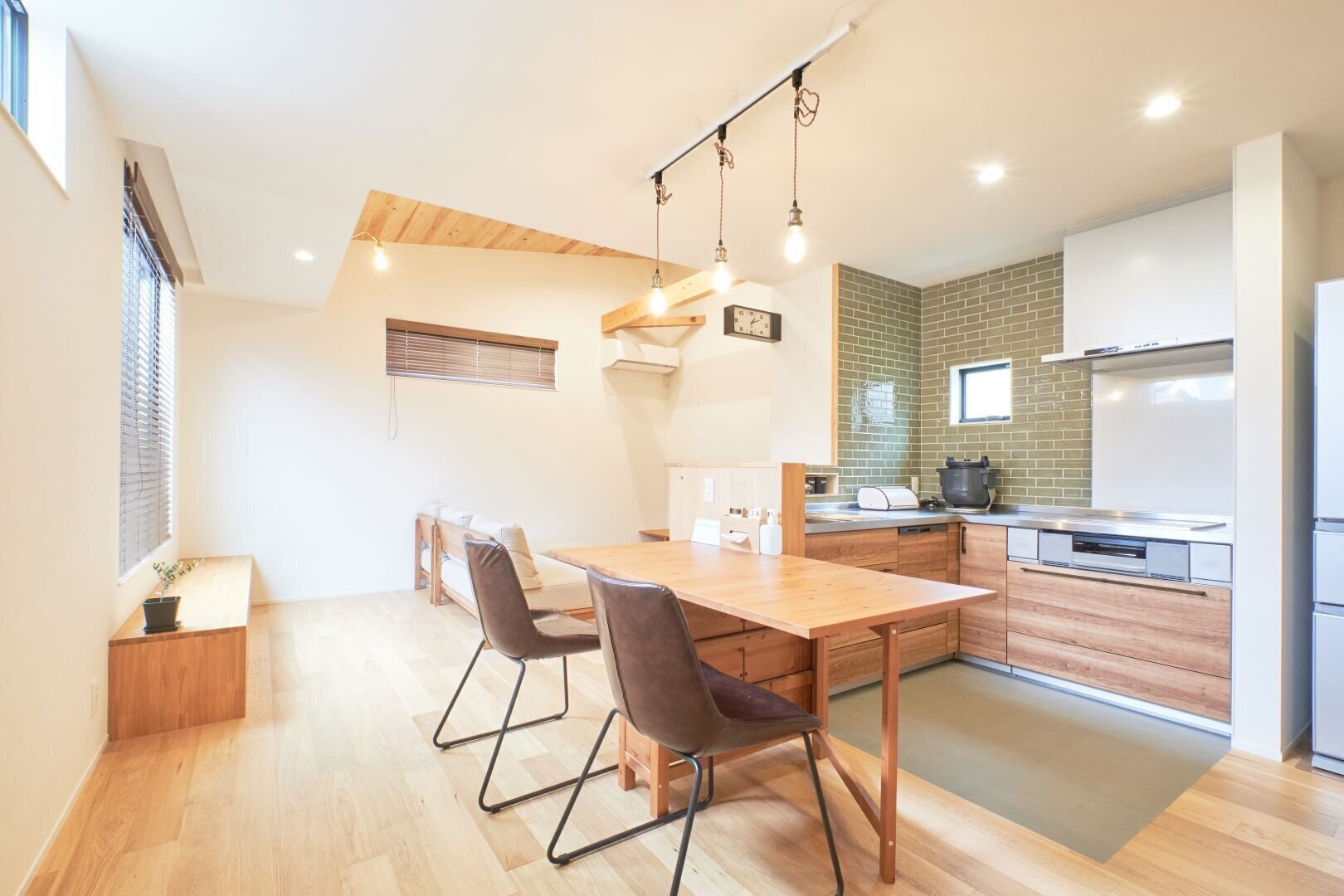 リビングは勾配天井で開放感たっぷり。L字型のキッチンからは家族と会話を楽しみながら料理ができ、快適な暮らしを叶える間取りとなっています。