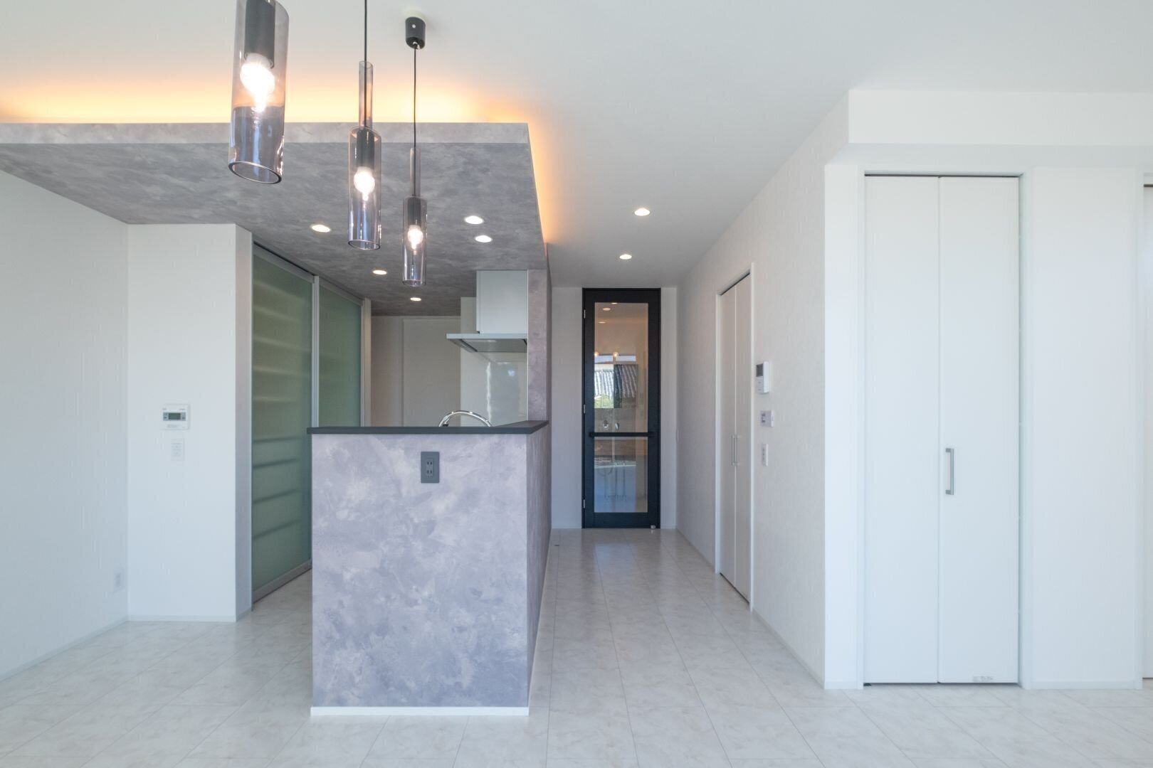 大きな窓から光が差し込むリビングは開放感たっぷりで、キッチンはグレーのアクセントと間接照明で上質な雰囲気に。